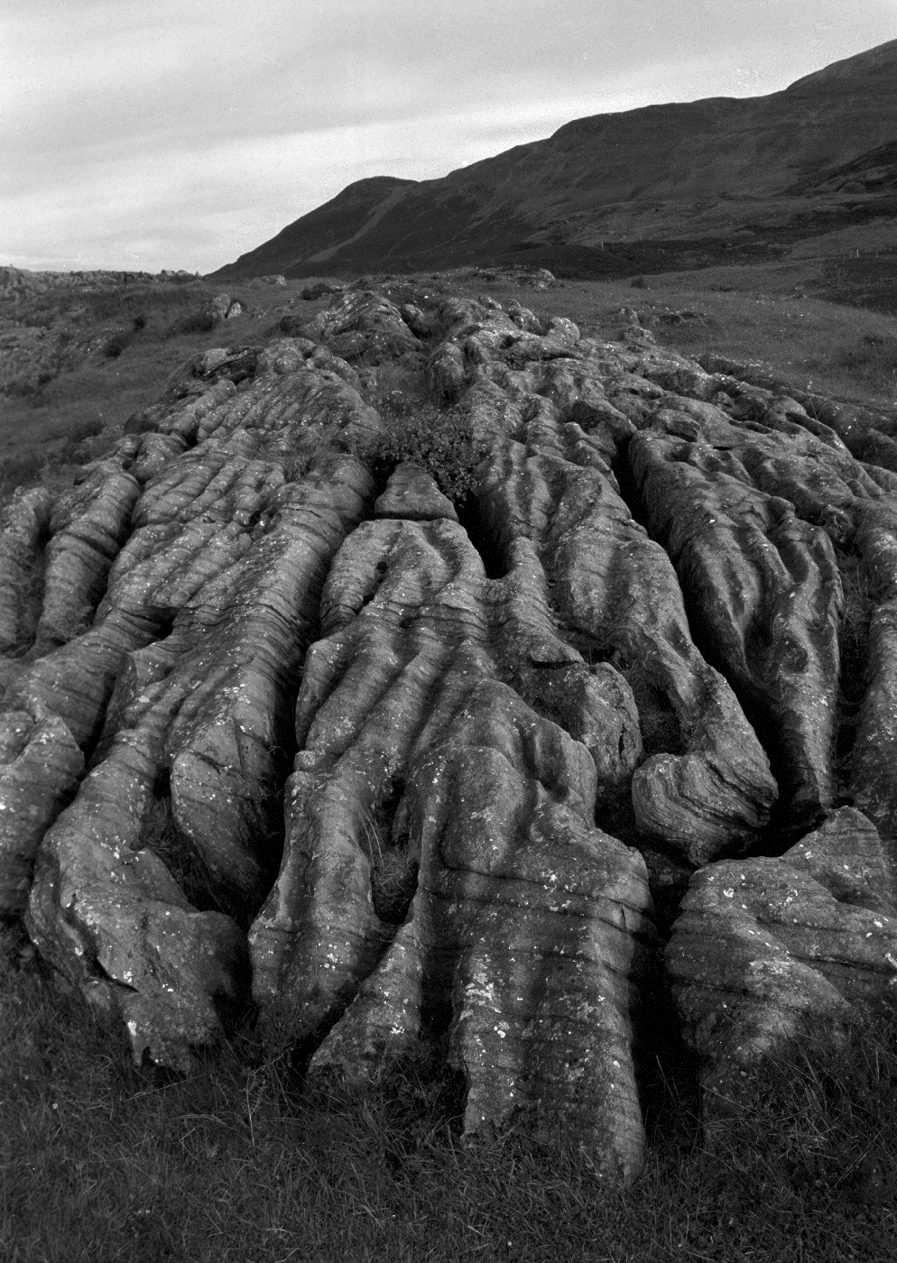 Yellow-weathering, ‘grey-hearted’ carbonate rock, calcareous schist and tremolitic amphibole schist are all represented in the thin, poorly exposed, Meall Dubh Limestone Formation. Biotite or phlogopite porphyroblasts are usually conspicuous in the latter two lithologies; colourless tremolite and green actinolite occur locally as rosettes. No sedimentary structures have been observed.
