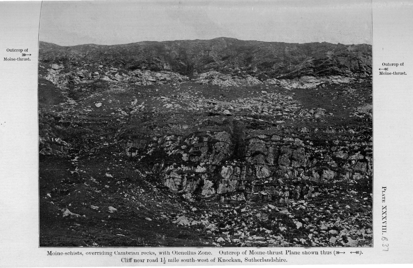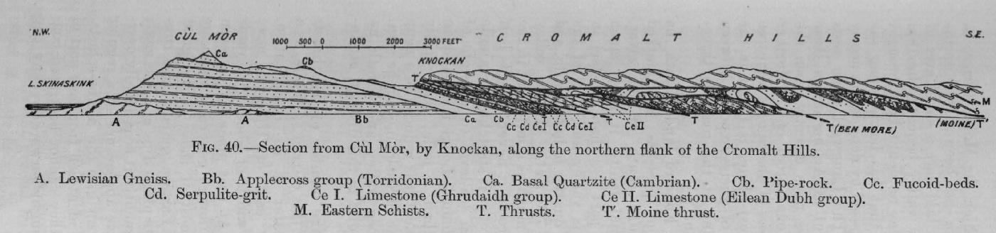 The ground to be described in this and the succeeding chapters differs in a marked degree from that which has been described in the foregoing pages. Owing to the extensive westward overlap of the Moine thrust-plane over all the lower dislocations, the belt of complicated structure has been reduced to a mere narrow stripe. No one, from the natural sections to be seen south of the county boundary between Sutherland and Ross, would suspect the existence of the extraordinary structure which is there concealed under the Eastern schists, but which, owing to extensive denudation, has been laid bare so instructively further north.