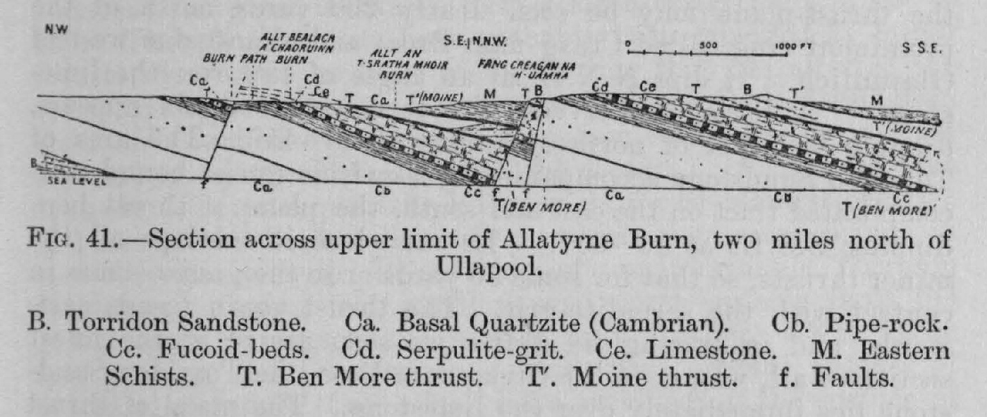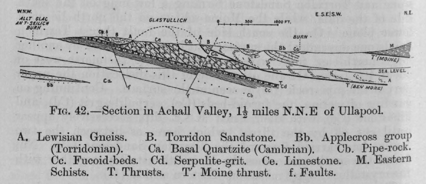 This section, beginning on the west near the small burn called Allt Glac an't Seilich, runs in a direction east by south towards the outlet of Loch Achall. The pipe-rock (Cb) is here succeeded in regular order and with the usual dip to E.S.E. by the fucoid beds and serpulite-grit (Cc and Cd). These strata are overlain by the thrust-plane, on which in the triangular area, above referred to, the limestone and other rocks have been thrust together in great confusion. Next comes a smaller thrust bringing in a slice of the pipe-rock, and then one of the larger thrusts, which has carried forward a portion of the Lewisian gneiss (A). A small fault (f) here throws down all these rocks to the east. On its further side the thrust-plane, as well as the rocks resting on it, has been bent into a synclinal fold, in which the Torridon Sandstone (B) lies unconformably on the gneiss (A). This thrust, whereby the gneiss has been driven forward, must overlap the lower thrust, which has pushed the quartzite over the limestone. The latter member of the Cambrian series is here apparently of great thickness, with a south-easterly dip of 40° to 50°. Though the strata have probably been repeated by minor thrusts, they show no trace of the folding that has affected the overlying thrust-planes. These planes before their denudation must have arched over the limestone somewhat in the manner represented by the dotted lines in the section. On the east side of the anticline the quartzite lying on its thrust-plane is overlain in turn by the higher dislocation, which once more brings in view the gneiss with its covering of unconformable Torridon Sandstone. Owing to a small normal north-easterly fault the gneiss again appears at the surface until further east it passes finally under the Torridon Sandstone (Bb). Some patches of the basal quartzite (Ca) which have survived on the surface of the sandstone not only illustrate the double unconformability of the Torridon series on the Lewisian gneiss and of the Cambrian quartzite on the Torridonian Sandstone, but indicate that the latter rock has been driven forward from some now concealed eastern area where its thickness is not great. The thrust rocks of Strath Kanaird prove that no Torridon Sandstone existed at that place in Cambrian time, for the quartzite rests there immediately on the Lewisian gneiss. Beyond some obscure ground the section reaches the Moine thrust and enters the region of the Eastern schists (M).