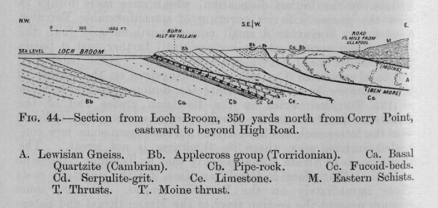 The belt of complication in its southward course now passes under the waters of Loch Broom. On the south-western side of this inlet of the sea it is found considerably to the south, the Moine thrust, for example, being about a mile to the south of its position where last seen on the opposite side. The plane of this thrust crops out opposite to Leckmelm House, and dips to the E.S.E. at 10° over much-altered Torridon Sandstone. It is immediately surmounted by the usual flaggy, grey quartzo- micaceous schists. The outcrop of the thrust-plane trends at first westwards, and then north of west for nearly a mile and a half altogether, rising gradually to over a thousand feet above the sea, and in the western part of its course forms a fine topographical feature. The gentle south-easterly dip of this plane or "sole" exactly coincides in some places with the slope of the ground. Only one other thrust makes its appearance here; it Is probably the continuation of that which brings on the Lewisian gneiss and patches of Torridon Sandstone to the east of Corry Point on the opposite side of the loch. On the shore its position is at first hidden by the raised beach of Newton Loggie, but it comes into sight west of the rocky knoll on which stand the ruins of the old Pictish tower called Dun Lagaidh. The plane of this thrust seems for a long distance to keep an even surface at the top of the serpulite-grit, over which comes a mass of Lewisian gneiss, covered with many unconformable patches of Torridon Sandstone. The gneiss continues to be the rock immediately resting on the sole of the thrust as far south as a little beyond Loch Lagaidh. The overlying Torridon Sandstone, much altered and with its bedding generally confused, now comes to lie on the thrust-plane for a quarter of a mile as a band not more than 70 or 80 yards broad. The gneiss soon reappears, however, for a short distance next to the thrust-plane until the sandstone resumes its place between that plane and the much-disturbed Cambrian strata.