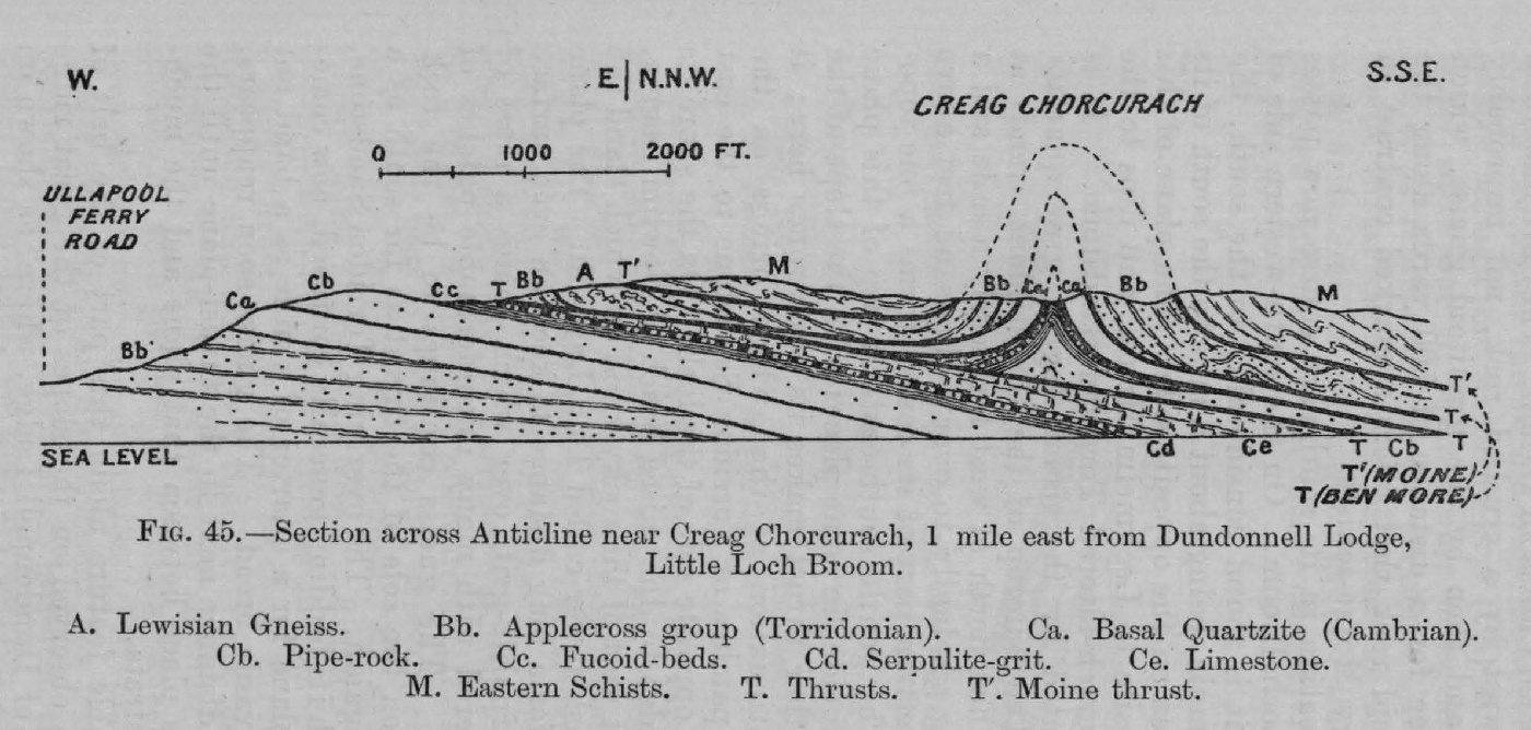 The most remarkable feature along this part of the belt of complication is to be observed on the slopes of the great ridge that rises to the east of Dundonnell Lodge, where, as shown on Sheet 92, an anticlinal loop of the thrust rocks strikes eastwards for about a mile, while the main mass of the Torridon Sandstone and of the Cambrian rocks that lie immediately to the westward have been unaffected by this plication. The outcrop of the Moine thrust-plane bends eastward on the north of this fold to return again on the south side, and resume thereafter its usual southerly direction. But this singular disturbance is not confined to the rocks that underlie the thrust-plane. It continues in the crystalline schists, which are found to be vertical or nearly so, right across the whole ridge eastward through Cnoc an Droighinn to the edge of Loch Broom. Not only so, but on the opposite side of the loch high dips also prevail among the Eastern schists on this line of complication for a long way to the east. Although much of the ground is obscured by peat and drift, enough of rock is exposed at the surface to afford a probable clue to the general structure of this portion of the complicated belt. The section in
